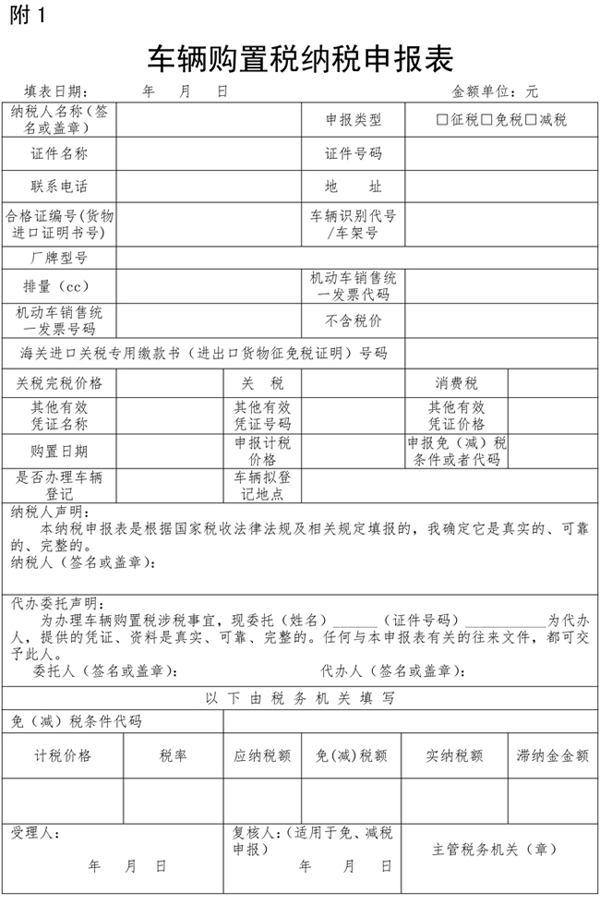《車輛購置稅納稅申報(bào)表》填表說明 1.本表由車輛購置稅納稅人在辦理納(免、減)稅申報(bào)時(shí)填寫(打印),由納稅人簽章確認(rèn)。 2.“納稅人名稱”欄,填寫辦理申報(bào)時(shí)提供的納稅人證件上注明的名稱。 3.“證件名稱”欄,單位納稅人填寫《統(tǒng)一社會(huì)信用代碼證書》或者《營業(yè)執(zhí)照》或者其他有效機(jī)構(gòu)證明;個(gè)人納稅人填寫《居民身份證》或者其他身份證明名稱。 4.“證件號(hào)碼”欄,填寫“證件名稱”欄填寫的證件的號(hào)碼。 5.“合格證編號(hào)(貨物進(jìn)口證明書號(hào))”“車輛識(shí)別代號(hào)/車架號(hào)”“廠牌型號(hào)”“排量(cc)”欄,分別按照車輛合格證或者《中華人民共和國海關(guān)貨物進(jìn)口證明書》或者《中華人民共和國海關(guān)監(jiān)管車輛進(jìn)(出)境領(lǐng)(銷)牌照通知書》或者《沒收走私汽車、摩托車證明書》中對(duì)應(yīng)的編號(hào)、車輛識(shí)別代號(hào)/車架號(hào)、車輛品牌和車輛型號(hào)、排量填寫。 6.“機(jī)動(dòng)車銷售統(tǒng)一發(fā)票代碼”“機(jī)動(dòng)車銷售統(tǒng)一發(fā)票號(hào)碼”“不含稅價(jià)”欄,分別按照機(jī)動(dòng)車銷售統(tǒng)一發(fā)票相應(yīng)項(xiàng)目填寫。 7.下列欄次由進(jìn)口自用車輛的納稅人填寫: 。1)“海關(guān)進(jìn)口關(guān)稅專用繳款書(進(jìn)出口貨物征免稅證明)號(hào)碼”欄,填寫《海關(guān)進(jìn)口關(guān)稅專用繳款書》中注明的號(hào)碼;免征關(guān)稅應(yīng)稅車輛填寫《進(jìn)出口貨物征免稅證明》中注明的編號(hào)。 (2)“關(guān)稅完稅價(jià)格”欄,通過《海關(guān)進(jìn)口關(guān)稅專用繳款書》《海關(guān)進(jìn)口消費(fèi)稅專用繳款書》《海關(guān)進(jìn)口增值稅專用繳款書》或者其他資料進(jìn)行采集,順序如下: 、佟逗jP(guān)進(jìn)口關(guān)稅專用繳款書》中注明的關(guān)稅完稅價(jià)格; 、 在免關(guān)稅的情況下,通過《海關(guān)進(jìn)口消費(fèi)稅專用繳款書》中注明的完稅價(jià)格和消費(fèi)稅稅額計(jì)算關(guān)稅完稅價(jià)格; ③ 在免關(guān)稅和免或者不征消費(fèi)稅的情況下,采用《海關(guān)進(jìn)口增值稅專用繳款書》中注明的完稅價(jià)格; 、 在關(guān)稅、消費(fèi)稅和增值稅均免征或者不征的情況下,通過其他資料采集關(guān)稅完稅價(jià)格。 。3)“關(guān)稅”欄,填寫《海關(guān)進(jìn)口關(guān)稅專用繳款書》中注明的關(guān)稅稅額。 (4)“消費(fèi)稅”欄,填寫《海關(guān)進(jìn)口消費(fèi)稅專用繳款書》中注明的消費(fèi)稅稅額。 8.“其它有效憑證名稱”“其它有效憑證號(hào)碼”“其它有效憑證價(jià)格”欄由未取得機(jī)動(dòng)車銷售統(tǒng)一發(fā)票且非進(jìn)口自用的納稅人按取得的相應(yīng)證明資料內(nèi)容填寫。 9.“購置日期”欄,填寫機(jī)動(dòng)車銷售統(tǒng)一發(fā)票或者海關(guān)進(jìn)口關(guān)稅專用繳款書(進(jìn)出口貨物征免稅證明)或者其他有效憑證的開具或者生效日期。 10.“申報(bào)計(jì)稅價(jià)格”欄,分別按照下列要求填寫: 。1)境內(nèi)購置車輛,按照車輛相關(guān)憑證的不含稅價(jià)填寫; 。2)進(jìn)口自用車輛,按計(jì)稅價(jià)格填寫,計(jì)稅價(jià)格=關(guān)稅完稅價(jià)格+關(guān)稅+消費(fèi)稅; 11.“申報(bào)免(減)稅條件或者代碼”欄,分別按照下列情形填寫文字或者代碼: A.外國駐華使館、領(lǐng)事館和國際組織駐華機(jī)構(gòu)及其有關(guān)人員自用的車輛,免稅; B.中國人民解放軍和中國人民武裝警察部隊(duì)列入裝備訂貨計(jì)劃的車輛,免稅; C.懸掛應(yīng)急救援專用號(hào)牌的國家綜合性消防救援車輛,免稅; D.設(shè)有固定裝置的非運(yùn)輸專用作業(yè)車輛,免稅; E.城市公交企業(yè)購置的公共汽電車輛,免稅; F.國務(wù)院規(guī)定予以免稅或者減稅的其他情形的,按照規(guī)定免稅或者減稅。 12.“是否辦理車輛登記”欄,如填寫“是”,則“車輛擬登記地點(diǎn)”欄應(yīng)填寫具體縣(市、區(qū))。 13.本表一式二份(一車一表),一份由納稅人留存,一份由主管稅務(wù)機(jī)關(guān)留存。