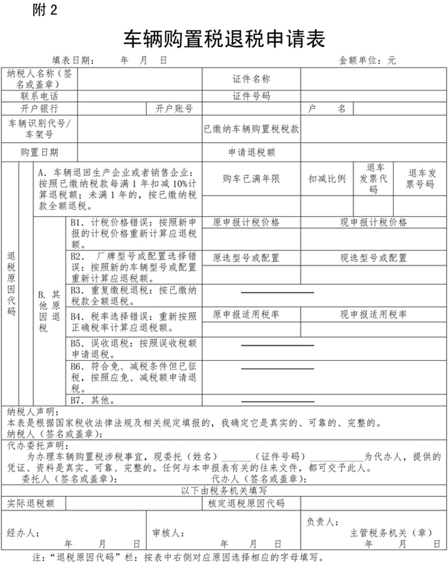 《車輛購置稅退稅申請(qǐng)表》填表說明 1.本表由車輛購置稅納稅人在辦理退稅申請(qǐng)時(shí)填寫(打印),由納稅人簽章確認(rèn)。 2.“納稅人名稱”欄,填寫辦理退稅申報(bào)時(shí)提供的納稅人證件上注明的名稱。 3.“證件名稱”欄,單位納稅人填寫《統(tǒng)一社會(huì)信用代碼證書》或者《營業(yè)執(zhí)照》或者其他有效機(jī)構(gòu)證明;個(gè)人納稅人填寫《居民身份證》或者其他身份證明名稱。 4.“證件號(hào)碼”欄,填寫“證件名稱”欄填寫的證件的號(hào)碼。 5.“開戶銀行”“賬號(hào)”“戶名”欄,填寫納稅人用來接收國庫退稅稅款的開戶銀行、賬號(hào)及開戶名稱。 6.“車輛識(shí)別代號(hào)/車架號(hào)”欄,按車輛合格證或者《中華人民共和國海關(guān)貨物進(jìn)口證明書》或者《中華人民共和國海關(guān)監(jiān)管車輛進(jìn)(出)境領(lǐng)(銷)牌照通知書》或者《沒收走私汽車、摩托車證明書》中對(duì)應(yīng)的車輛識(shí)別代號(hào)(車架號(hào))填寫。 7.“已繳納車輛購置稅稅款”欄,填寫主管稅務(wù)機(jī)關(guān)開具的車輛購置稅繳稅憑證上注明的繳稅金額。 8.“購置日期”欄,填寫機(jī)動(dòng)車銷售統(tǒng)一發(fā)票(或者有效憑證)上注明的開票日期。 9.“申請(qǐng)退稅額”欄,填寫納稅人向稅務(wù)機(jī)關(guān)申請(qǐng)的退稅金額。 10.“退稅原因代碼”欄,按表中右側(cè)對(duì)應(yīng)原因選擇相應(yīng)的字母填寫。 11.本表(一車一表)一式三份,一份由納稅人留存;一份由國庫留存;一份由主管稅務(wù)機(jī)關(guān)留存。