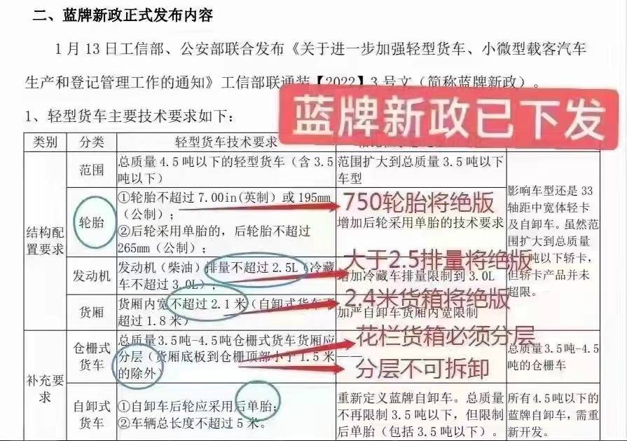 2022年藍(lán)牌專用汽車車輛上牌新規(guī)定解讀大噸小標(biāo)不可取。工業(yè)和信息化部 公安部關(guān)于進(jìn)一步加強(qiáng)輕型貨車、小微型載客汽車生產(chǎn)和登記管理工作的通知:近年來(lái),輕型貨車“大噸小標(biāo)”、小微型載客汽車違法載人載貨引發(fā)的道路交通事故多發(fā),給人民群眾生命財(cái)產(chǎn)安全造成重大損失,成為嚴(yán)重道路交通安全隱患。為貫徹落實(shí)《全國(guó)安全生產(chǎn)專項(xiàng)整治三年行動(dòng)計(jì)劃》和《道路運(yùn)輸安全專項(xiàng)整治三年行動(dòng)實(shí)施方案》要求,切實(shí)加強(qiáng)車輛生產(chǎn)和登記管理,進(jìn)一步提高輕型貨車、小微型載客汽車安全技術(shù)性能,現(xiàn)將有關(guān)事項(xiàng)通知如下: 一、提高輕型貨車、小微型載客汽車安全技術(shù)要求 (一)為從產(chǎn)品源頭有效消除輕型貨車“大噸小標(biāo)”、超載運(yùn)輸隱患,遏制小微型載客汽車非法改裝行為,自本通知發(fā)布之日起,新申報(bào)《道路機(jī)動(dòng)車輛生產(chǎn)企業(yè)及產(chǎn)品公告》(以下簡(jiǎn)稱《公告》)的輕型貨車產(chǎn)品應(yīng)當(dāng)增加貨廂材質(zhì)、厚度、重量等參數(shù)信息,小微型載客汽車產(chǎn)品應(yīng)當(dāng)增加座椅布置、固定方式等參數(shù)信息。新申報(bào)產(chǎn)品及已列入《公告》的在產(chǎn)產(chǎn)品,除需符合國(guó)家有關(guān)政策和強(qiáng)制性標(biāo)準(zhǔn)要求外,還需滿足本通知附件《輕型貨車、小微型載客汽車安全技術(shù)規(guī)范》(以下簡(jiǎn)稱《技術(shù)規(guī)范》)規(guī)定要求。不符合本通知《技術(shù)規(guī)范》要求的新產(chǎn)品,工業(yè)和信息化部將不予公告。 (二)不符合本通知《技術(shù)規(guī)范》要求的在產(chǎn)產(chǎn)品,2022年3月1日起,生產(chǎn)企業(yè)應(yīng)立即停止生產(chǎn),相關(guān)機(jī)構(gòu)應(yīng)立即停止接收相關(guān)產(chǎn)品合格證信息;其中,對(duì)已列入《公告》的排量大于2.5升但符合本通知其他要求的輕型貨車在產(chǎn)產(chǎn)品,給予生產(chǎn)銷售過(guò)渡期6個(gè)月,過(guò)渡期滿后,生產(chǎn)企業(yè)應(yīng)立即停止生產(chǎn),相關(guān)機(jī)構(gòu)應(yīng)立即停止接收相關(guān)產(chǎn)品合格證信息。 (三)對(duì)2022年3月1日前已生產(chǎn)并已上傳合格證、但不符合本通知《技術(shù)規(guī)范》要求的庫(kù)存產(chǎn)品,生產(chǎn)企業(yè)可向工業(yè)和信息化部提出庫(kù)存延期銷售申請(qǐng),并隨附庫(kù)存清單以及生產(chǎn)企業(yè)關(guān)于該型產(chǎn)品無(wú)“大噸小標(biāo)”等違規(guī)情況、自愿承擔(dān)相關(guān)法律責(zé)任的書面材料,經(jīng)履行核實(shí)、公示等相關(guān)程序,可給予6個(gè)月延期銷售、注冊(cè)登記期限。根據(jù)道路運(yùn)輸安全專項(xiàng)整治行動(dòng)進(jìn)展的具體情況,工業(yè)和信息化部、公安部將適時(shí)修訂完善《技術(shù)規(guī)范》。 二、落實(shí)生產(chǎn)企業(yè)產(chǎn)品安全質(zhì)量、生產(chǎn)一致性主體責(zé)任 (四)生產(chǎn)企業(yè)應(yīng)當(dāng)提高安全責(zé)任和風(fēng)險(xiǎn)防控意識(shí),嚴(yán)格落實(shí)產(chǎn)品安全質(zhì)量、生產(chǎn)一致性主體責(zé)任,合法守信進(jìn)行生產(chǎn)經(jīng)營(yíng),健全相關(guān)管理制度,加強(qiáng)車輛產(chǎn)品出廠前安全質(zhì)量檢驗(yàn),確保批產(chǎn)產(chǎn)品符合國(guó)家強(qiáng)制性標(biāo)準(zhǔn)和有關(guān)規(guī)定要求,確保批產(chǎn)產(chǎn)品與公告型式批準(zhǔn)車型規(guī)格參數(shù)一致,切實(shí)提高車輛產(chǎn)品安全性能。 (五)采用委改方式生產(chǎn)的貨車整車生產(chǎn)企業(yè)承擔(dān)委改產(chǎn)品安全質(zhì)量、生產(chǎn)一致性完全責(zé)任,要制定辦法對(duì)委改企業(yè)加強(qiáng)管理,對(duì)委托改裝車輛產(chǎn)品實(shí)施質(zhì)量控制和生產(chǎn)一致性管理,保證委改產(chǎn)品參數(shù)與許可參數(shù)一致。 (六)生產(chǎn)企業(yè)應(yīng)加強(qiáng)對(duì)機(jī)動(dòng)車整車出廠合格證管理,在機(jī)動(dòng)車制造完畢且檢驗(yàn)合格后實(shí)時(shí)填報(bào)、傳送合格證電子信息,合格證載明的信息應(yīng)當(dāng)與《公告》產(chǎn)品技術(shù)參數(shù)以及產(chǎn)品實(shí)際技術(shù)參數(shù)一致,不得銷售尚未傳送合格證電子信息的機(jī)動(dòng)車,嚴(yán)禁上傳未生產(chǎn)下線機(jī)動(dòng)車整車合格證電子信息。嚴(yán)禁為同一機(jī)動(dòng)車配發(fā)不同《公告》型號(hào)的機(jī)動(dòng)車整車出廠合格證,嚴(yán)禁對(duì)檢驗(yàn)不合格、不符合生產(chǎn)一致性要求的車輛出具整車出廠合格證明。對(duì)不符合本通知要求的已公告產(chǎn)品,生產(chǎn)企業(yè)應(yīng)組織進(jìn)行設(shè)計(jì)整改,經(jīng)整改確認(rèn)符合要求的,可恢復(fù)其產(chǎn)品生產(chǎn)及合格證傳送。 三、嚴(yán)把車輛產(chǎn)品檢驗(yàn)機(jī)構(gòu)產(chǎn)品檢測(cè)關(guān) (七)承擔(dān)《公告》車輛產(chǎn)品檢測(cè)工作的車輛檢驗(yàn)機(jī)構(gòu)要嚴(yán)把產(chǎn)品檢測(cè)關(guān),在對(duì)申報(bào)《公告》的樣車進(jìn)行檢驗(yàn)時(shí),嚴(yán)格按照國(guó)家標(biāo)準(zhǔn)和有