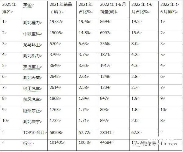 2022年上半年環(huán)衛(wèi)車市場趨勢:湖北程力、福建龍馬、中聯(lián)重科居前三,新能源專用汽車表現(xiàn)搶眼。環(huán)衛(wèi)車屬于商用車行業(yè)中專用車類的一個(gè)小眾市場,包括各類垃圾車、灑水車、洗掃車、吸污車等。近年來隨著經(jīng)濟(jì)的發(fā)展與人民生活水平的不斷提高,特別是近期受疫情的影響,人們對(duì)環(huán)境衛(wèi)生質(zhì)量的要求越來越高,同時(shí)隨著垃圾分類、城鎮(zhèn)化、農(nóng)村環(huán)境整治等利好政策得到有效落地執(zhí)行,將促進(jìn)垃圾車、清掃車等環(huán)衛(wèi)車輛需求呈穩(wěn)定上升趨勢,因此環(huán)衛(wèi)車市場已引起業(yè)內(nèi)的關(guān)注。但由于受疫情影響,今年上半年環(huán)衛(wèi)車市場也遭遇下滑。 根據(jù)終端上牌信息,2022年6月環(huán)衛(wèi)車銷量8629輛,環(huán)比(今年5月環(huán)衛(wèi)車銷量8019輛)增長7.6%,同比(去年6月銷量10385輛,見截圖1)下降16.9%,2022年1-6月環(huán)衛(wèi)車?yán)塾?jì)銷售44584輛,同比(2021年前6月累計(jì)銷售54801輛)下降18.6%,累計(jì)降幅比1-5月(1-5月累計(jì)同比下降19%)縮窄近0.4個(gè)百分點(diǎn)。 截圖1,2021年各月環(huán)衛(wèi)車銷量(數(shù)據(jù)來源:汽車智庫) 按功能用途劃分,2022年6月及前6月,環(huán)衛(wèi)車中垃圾車銷量均為最多,分別銷售3133輛和累計(jì)銷售16413輛,占據(jù)環(huán)衛(wèi)車的市場份額分別為36.3%和36.2%;其次是灑水車;再次是吸污車;第四是洗掃車; 在2022年6月及前6月環(huán)衛(wèi)車銷量最大的垃圾車市場中,車廂可卸式垃圾車占比均超半壁江山,領(lǐng)跑垃圾車各細(xì)分車型銷量; 按燃料種類劃分,今年上半年柴油類環(huán)衛(wèi)車仍占主體,但主體地位有減弱趨勢;新能源環(huán)衛(wèi)車?yán)塾?jì)銷售2240輛,市場占比超5%,且占比比2021年增加1.32個(gè)百分點(diǎn),領(lǐng)漲環(huán)衛(wèi)車各細(xì)分市場,表現(xiàn)搶眼,其中新能源自卸式垃圾車?yán)塾?jì)銷售472輛,領(lǐng)領(lǐng)跑新能源環(huán)衛(wèi)車各細(xì)分車型; 從今年上半年環(huán)衛(wèi)車的區(qū)域市場流向看,湖北、山東、廣東居前三; 從今年上半年企業(yè)具體表現(xiàn)看,湖北程力、長沙中聯(lián)重科、福建龍馬環(huán)衛(wèi)車居前三。 下面對(duì)今年上半年環(huán)衛(wèi)車市場特點(diǎn)進(jìn)行解讀。 特點(diǎn)一:按功能用途劃分,各類垃圾車銷量占比超三之一,居榜首 表1,2022年6月及1-6月各類環(huán)衛(wèi)車銷量同比、占比及占比同比增減(數(shù)據(jù)來源:汽車智庫及終端上牌信息) 2022年上半年環(huán)衛(wèi)車市場趨勢:湖北程力、福建龍馬、中聯(lián)重科居前三,新能源專用汽車表現(xiàn)搶眼。 ---各類環(huán)衛(wèi)車單月和累計(jì)分別銷售3133輛和16143輛,占比分別為36.3%和36.2%,均超環(huán)衛(wèi)車整體市場的三分之一份額,均居第一,說明垃圾車是環(huán)衛(wèi)車中需求最多的細(xì)分車型; ---灑水車單月和累計(jì)分別銷售2261輛和11742輛,占比分別是26.2%和26.3%,均居第二; ---吸污車單月和累計(jì)分別銷售1950輛和10161輛,占比分別為22.6%和22.8%,居第三; ---清掃車單月和累計(jì)銷量分別為1285輛和6538輛,占比分別為14.89%和14.67%,居第四,是環(huán)衛(wèi)車中占比相對(duì)較小的細(xì)分車型。 總之,無論是今年6月還是今年上半年,垃圾車占比均超三分之一,成為環(huán)衛(wèi)車中占比最高、最受市場青睞的細(xì)分車型。 特點(diǎn)二:車廂可卸式垃圾車占比超半壁江山,領(lǐng)跑垃圾車市場 表2,根據(jù)終端上牌信息,2022年6月及前6月各類垃圾車銷量、占比統(tǒng)計(jì): 上表可見,2022年6月及1-6月各類垃圾車銷量及占比呈現(xiàn)以下特點(diǎn): ---車廂可自卸式垃圾車單月及累計(jì)銷量分別為1660輛和8158輛,占比分別為50.1%和50.5%,占比均超半壁江山,均居第一,領(lǐng)跑各類垃圾車市場,說明車廂可卸式垃圾車最受垃圾車市場歡迎; ---壓縮式垃圾車單月和累計(jì)銷量分別為1098輛和5688輛,占比分別為35.1%和35.2%,均居第二; ---密封式垃圾車和拉臂式垃圾車無論是單月和累計(jì)銷量占比均很小; ---其他垃圾車單月和累計(jì)銷量分別為395輛和2005輛,主要包括各種倉廚垃圾車、掛桶式垃圾車等,占比分別為12.6%和12.5%。 特點(diǎn)三:新能源環(huán)衛(wèi)車占比增加最多,表現(xiàn)搶眼 截圖2,2019年—2021年各類動(dòng)力環(huán)衛(wèi)車銷量占比(來源:汽車智庫平臺(tái)) 表3,根據(jù)終端上牌及汽車智庫平臺(tái)數(shù)據(jù),按動(dòng)力燃料種類劃分,2022年上半年各類環(huán)衛(wèi)車銷量及占比統(tǒng)計(jì): 上圖表可見,按動(dòng)力中了劃分,在今年上半年的環(huán)衛(wèi)車銷量結(jié)構(gòu)中: ---柴油類環(huán)衛(wèi)車?yán)塾?jì)銷售38342輛,占比86%,仍然占據(jù)絕對(duì)的霸主地位,但占比與2021年比減少1.4個(gè)百分點(diǎn),與2020年、2019年比減少更多,可見近年來柴油動(dòng)力環(huán)衛(wèi)車占比有逐年減少的趨勢; ---汽油動(dòng)力環(huán)衛(wèi)車占比7%,居第二,且與近年比有微弱增長的跡象; ---新能源環(huán)衛(wèi)車(幾乎都是純電動(dòng)類)累計(jì)銷售2240輛,占比5.02%,與2021年比占比增加1.32個(gè)百分點(diǎn),是占比增加最多的細(xì)分車型,與2020年和2019年比增加更多,說明目前新能源環(huán)衛(wèi)車增長的勢頭最為強(qián