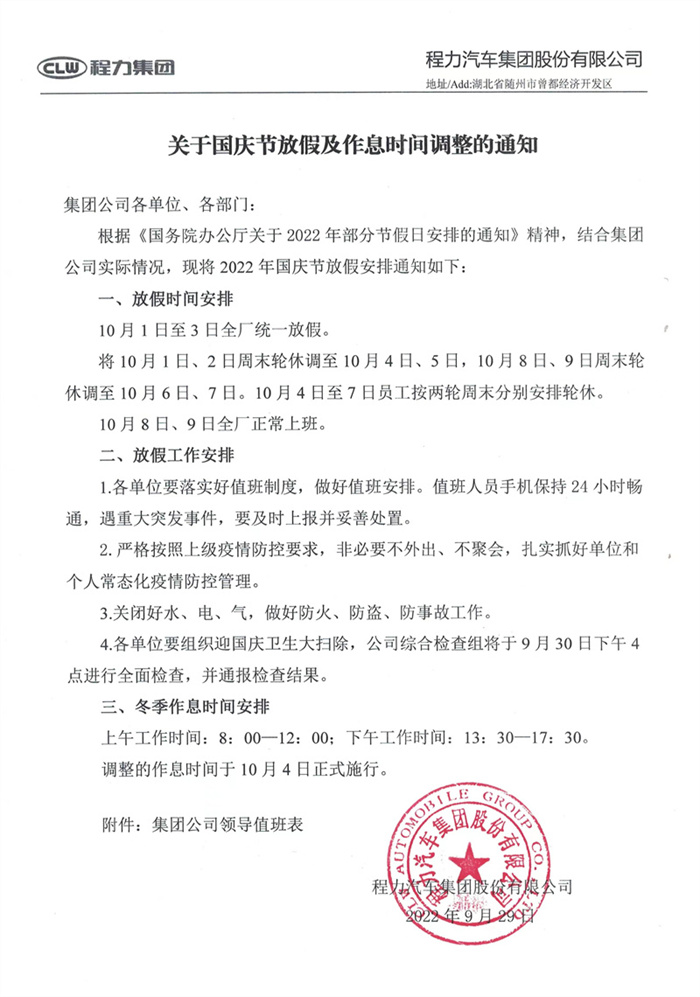 湖北程力集團(tuán)關(guān)于國(guó)慶節(jié)放假及作息時(shí)間調(diào)整的通知