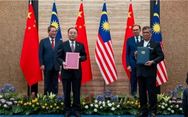 會(huì)談后,在兩位領(lǐng)導(dǎo)人的共同見證下,兩國(guó)簽署了14項(xiàng)合作協(xié)議和備忘錄,其中包括兩國(guó)民眾期待已久的《馬來西亞鮮食榴梿輸華植物檢疫要求議定書》,也意味著馬來西亞新鮮榴蓮可以向中國(guó)出口。簽署儀式于今天上午11時(shí)許在布城首相辦公室舉行,多位馬來西亞內(nèi)閣部長(zhǎng)和中方部長(zhǎng)分別代表兩國(guó)簽署。