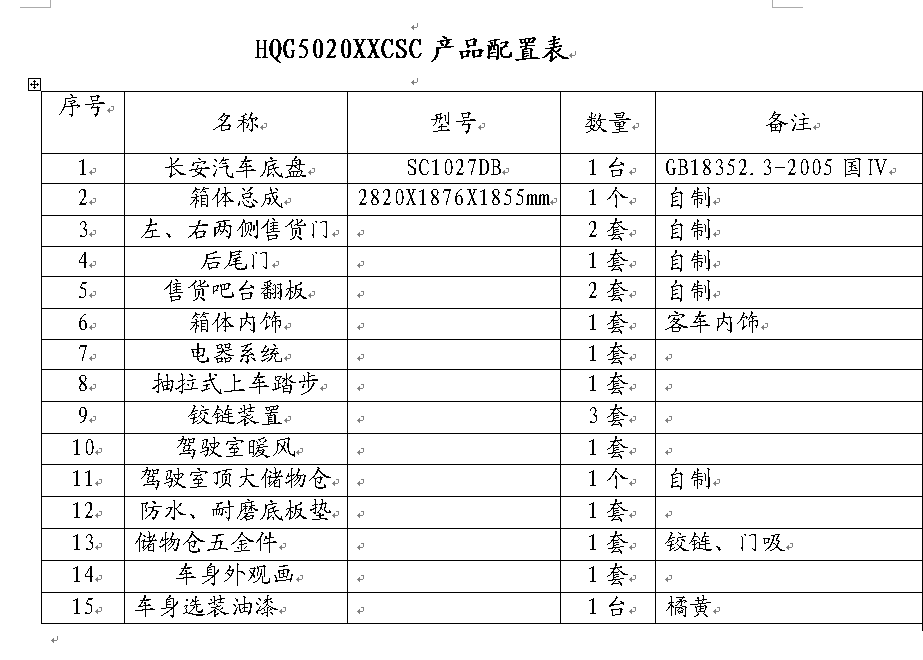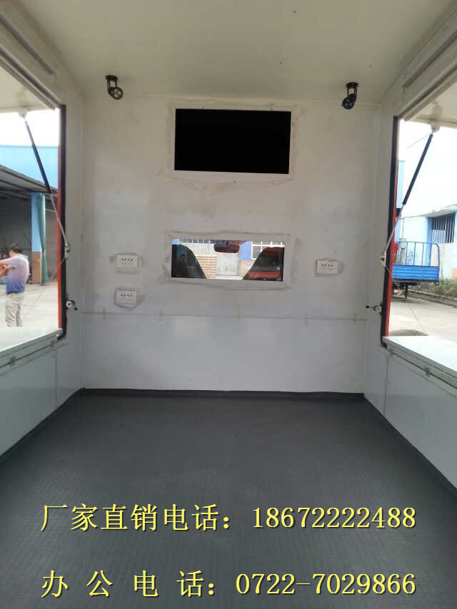 1.車廂頂部封閉選裝通風(fēng)窗時(shí),高2590mm;選裝頂置空調(diào)時(shí),高2890 mm.2左右兩側(cè)及后部均可選裝led屏、廣告滾軸燈箱、玻璃窗或上掀門(mén)。3.該車前部頂端兩側(cè)裝有喇叭,可進(jìn)行聲音宣傳.4.該車裙邊工具箱艙門(mén)可選裝.5.側(cè)部和后下部防護(hù)裝置為鋼板整體式側(cè)圍防護(hù)結(jié)構(gòu),離地高度300mm,側(cè)部和后下部防護(hù)裝置材料材質(zhì)為Q235A.發(fā)動(dòng)機(jī)型號(hào)/最大凈功率(kw)分別為:JL466Q1/46.56;6.可以選裝不同車體顏色和外觀貼畫(huà).