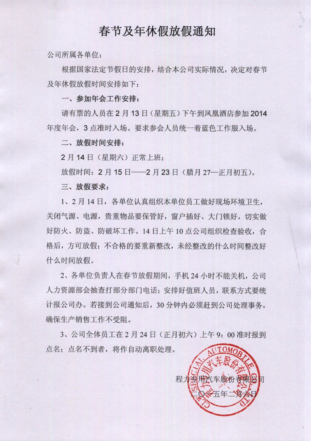 | 辭舊迎新的時刻就要來臨,湖北程力汽車銷售部感謝有你,坎坷的2014終于完美收官,讓我們一起迎接美好的 ️ ️ ️ ️!感謝那些一直支持丶幫助我的朋友們和同事,與其新老顧客們,在新的一年我將用更優(yōu)質(zhì)的服務回報您的支持與信任!新年到來之際祝所有朋友及其家人新的一年五羊 開泰,幸福安康、事業(yè)更上一層樓!在此祝新老顧客過個愉快的新春佳節(jié),歡迎來電咨詢:0722-7029866.18672222488 2015年湖北程力春節(jié)公司放假安排如下: 一、公司定于2015年2月13日下午3:30準時到鳳凰大酒店參加2014年度工作總結(jié)表彰大會,暨2015新年團拜會,要求參會人員統(tǒng)一著裝藍色工作服入場,服從會場指揮人員的安排,遵守會場紀律。 二、公司定于2015年2月15日(臘月27)正式放假,2月24日(正月初六)上午9:00準時報到點名,點名不到者,將作自動離職處理。 三、2月15日(農(nóng)歷臘月二十七),各單位認真組織本單位員工做好現(xiàn)場環(huán)境衛(wèi)生,做到設備干凈無油污、無灰塵,安全通道暢通,地面衛(wèi)生清潔整潔,電器電源關閉,貴重物品要保管好,鎖好車間大門,要做好防火、防盜、防破壞工作。公司組織檢查驗收合格后,方可放假。 四、各單位負責人在春節(jié)放假期間,手機24小時不能關機,安排好值班人員,聯(lián)系方式要統(tǒng)計。若接到公司通知后,30分鐘內(nèi)必須趕到公司處理事務,確保生產(chǎn)銷售工作不受阻。 ![]() 放假期間,請大家一定要注意人身安全,并按時返回,如遇非人為原因無法按時返回,請及時向主管部門告假。最后衷心祝愿大家過個歡樂、祥和的春節(jié),羊年年平安順利快樂健康!全家喜洋洋。。 |