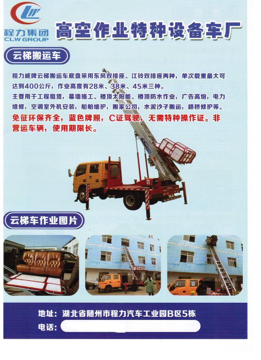 你還在為搬家樓層高、爬樓梯發(fā)愁嗎?湖北程力為你推薦一款云梯式搬家車.云梯車主要是隨著城市高層建筑的發(fā)展而發(fā)展起來的,其在現(xiàn)代城市發(fā)揮著越來越重要的作用。究其原因,主要是云梯車本身具有諸多其他消防及特種設(shè)備無法比擬的優(yōu)勢,具有應(yīng)用范圍廣、作業(yè)區(qū)域大、安全限位保護措施及應(yīng)急 操作系統(tǒng)完備、機動靈活、轉(zhuǎn)場方便等特點。