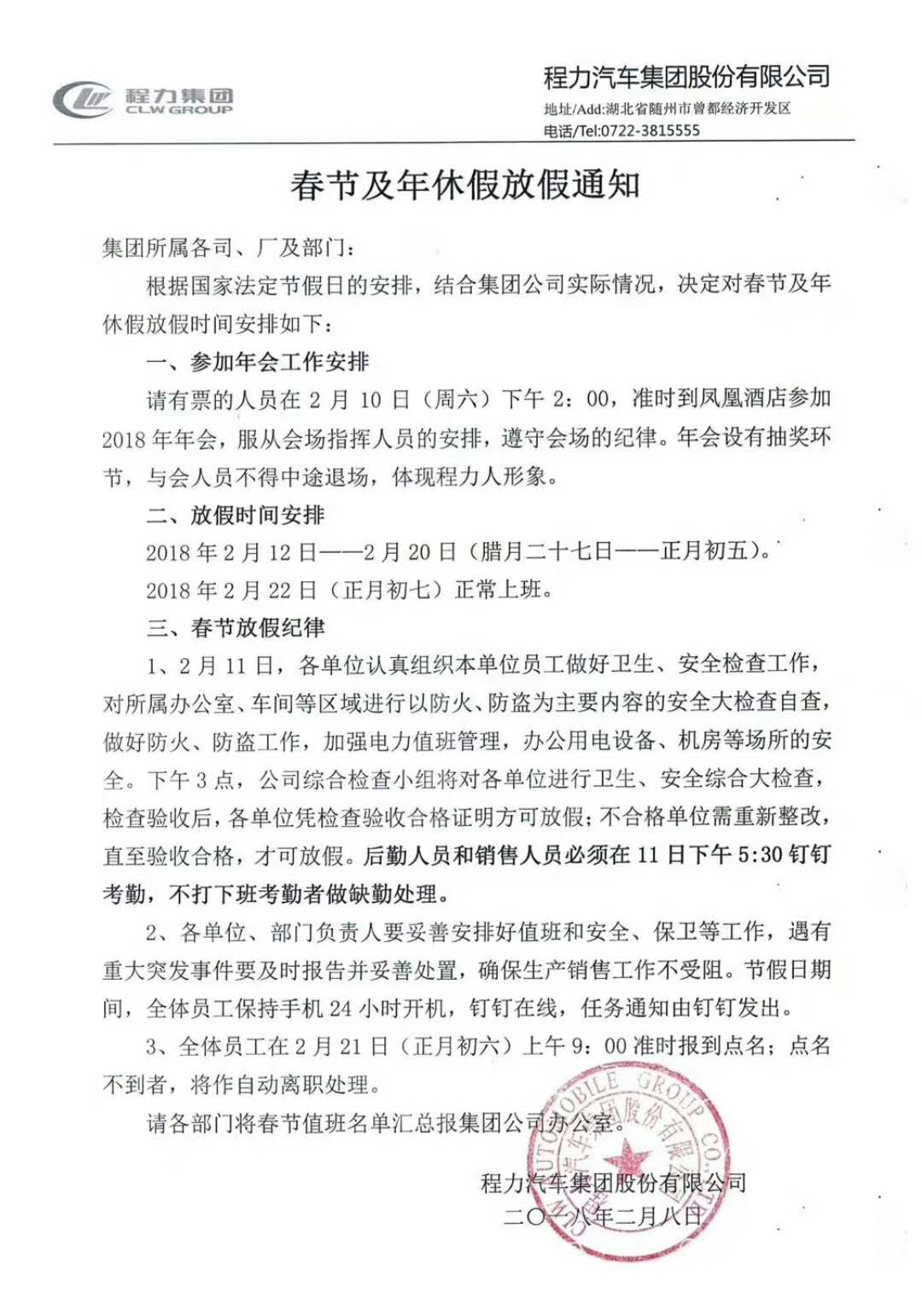 湖北程力汽車集團股份有限公司2018年春節(jié)及年休假放假通知