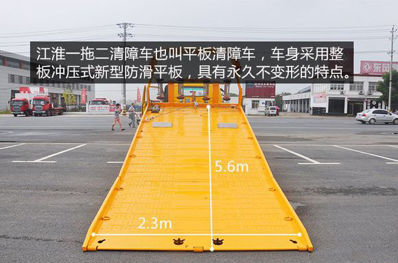 江淮平板一拖二清障車也叫江淮平板清障車,車身采用整板沖壓式新型防滑平板,具有永久不變形的特點。平板長5.6米,寬2.3米,平板承載量為4噸,一般的家用轎車都能輕松拖起。
