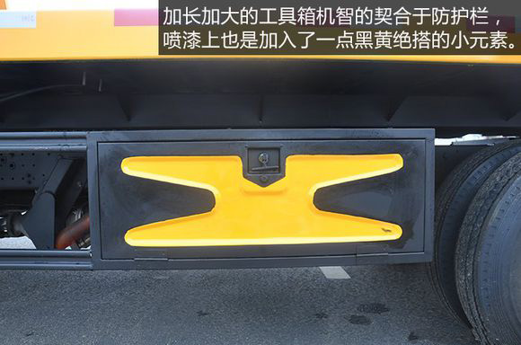 加長加大的工具箱機智的契合于防護欄,噴漆上也是加入了一點黑黃絕搭的小元素,絲毫不顯突兀,完美的融入整車色調。