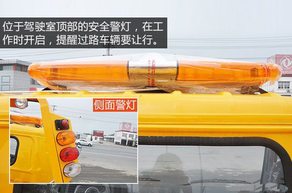 位于駕駛室頂部的安全警燈,在工作時開啟,提醒過路車輛要讓行,另外平板上方的架子左右各加裝有長排24V電子安全警示燈,進一步的加強了安全性。