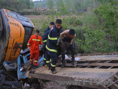 消防官兵到達(dá)現(xiàn)場(chǎng)后,發(fā)現(xiàn)一輛貨車車頭直接扎入溝中,在貨車上的挖掘機(jī)側(cè)翻在一旁,當(dāng)?shù)嘏沙鏊?20急救人員已經(jīng)趕到了現(xiàn)場(chǎng)。見此情形,消防官兵迅速展開營(yíng)救,但由于貨車狠狠的撞在田埂上,駕駛室已經(jīng)嚴(yán)重變形,消防官兵利用液壓剪擴(kuò)鉗、液壓撐頂器等破拆工具均未能使駕駛室有效擴(kuò)張,而且挖掘機(jī)隨時(shí)有壓下來的危險(xiǎn)。于是,中隊(duì)指揮員立即協(xié)調(diào)公安部門,將附近的一輛挖掘機(jī)借調(diào)過來,配合消防官兵實(shí)施營(yíng)救。 挖掘機(jī)到位后,指揮員立即下令挖掘機(jī)將貨車車身往后牽引,使車頭留有救援空間供消防官兵救援。命令下達(dá)后,救援人員各司其職,迅速的投入到戰(zhàn)斗中去。 19時(shí)05分,通過消防官兵1個(gè)多小時(shí)的緊張救援,貨車司機(jī)被成功救出,但由于撞擊嚴(yán)重,被困時(shí)間過長(zhǎng),醫(yī) |