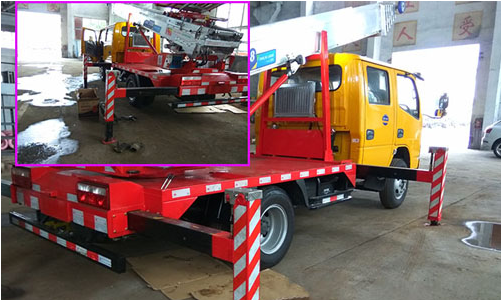后車板安裝四條H型支腿,通過操作桿液壓控制,可同時自動伸縮。液壓支腿先水平向外伸展然后再垂向下展開,兩邊完全伸展開大約五米左右。液壓支腿控制整個車的平衡,碳鋼材質(zhì)制成結(jié)實耐用。