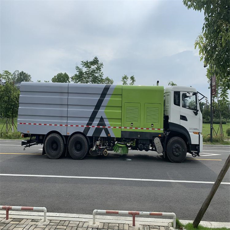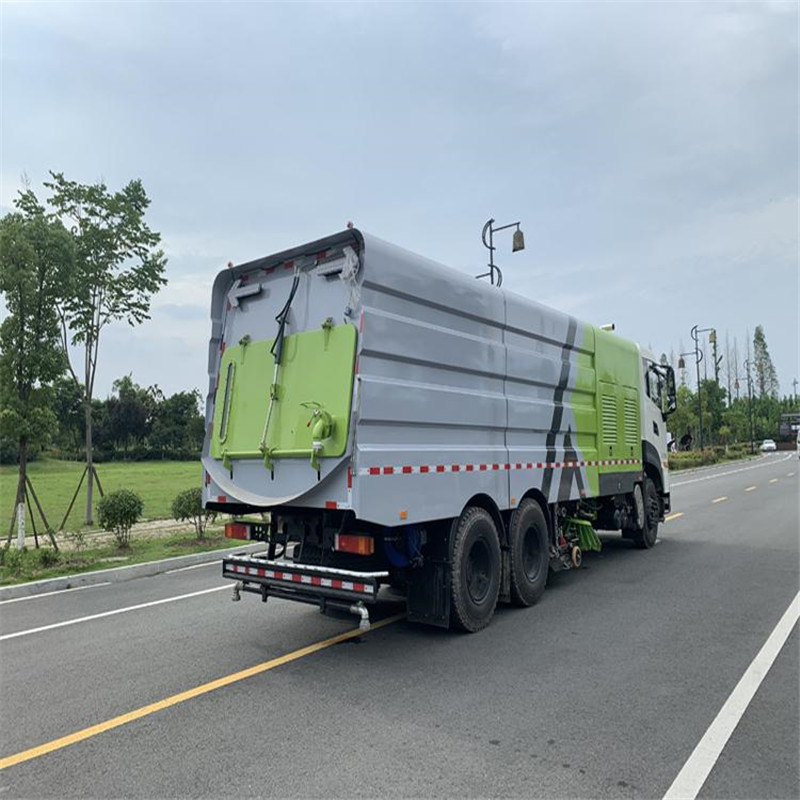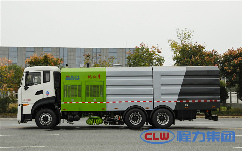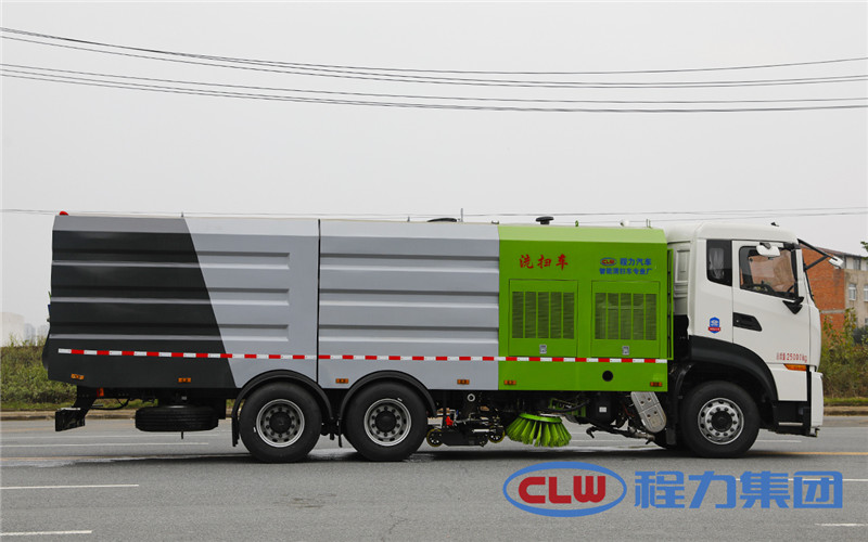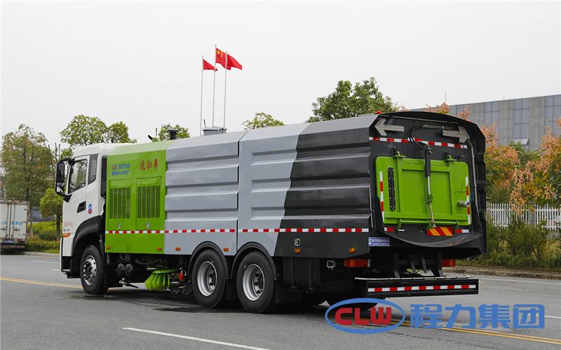 東風(fēng)天龍洗掃車副發(fā)動機驅(qū)動風(fēng)機和高壓水泵,副發(fā)動機采用東風(fēng)康明期6缸柴油發(fā)動機。 風(fēng)機用8.0高壓離心風(fēng)機,效率高、風(fēng)量大,最高風(fēng)量達23500m3/h。 東風(fēng)天龍洗掃車高壓水泵采用同際知名T7012IR 型柱塞柱,流量合適,壓力高,允許最高壓力達10MPa,清水箱充分利用了車載空間,容積大,容積達12m3。 東風(fēng)天龍洗掃車垃圾箱采用單層不銹鋼結(jié)構(gòu),傾翻卸料,帶高壓位自潔裝置。自潔裝置可在垃圾箱卸料時幫助卸料,清洗垃圾箱內(nèi)部。 東風(fēng)天龍洗掃車左右立掃為單掃盤,減少了掃刷數(shù)量和掃刷消耗量,能降低使用成本。左右立掃分開控制,可實現(xiàn)左掃、右掃和全掃等不同作業(yè)模式。寬吸嘴的吸口寬度達到2418mm,確保作業(yè)總寬度大于3.5mm。 湖北程力國六東風(fēng)天龍后雙橋大型洗掃4個高度可調(diào)的吸嘴輪,能方面調(diào)整和保證吸嘴與路面間的合理間隙。吸嘴內(nèi)高有噴水桿,盡可能多地將高壓洗滌噴嘴布置在吸嘴內(nèi)部,不但清洗效果好,還能最大限度減少高壓水氣流沖起污物產(chǎn)生的二次污染。左右噴水桿安裝在吸嘴上,隨吸嘴升降,結(jié)構(gòu)簡單緊湊,保證噴水桿的離地高度固定不變,達到最佳清洗效果。 東風(fēng)天龍洗掃車開式液壓系統(tǒng)驅(qū)動左右立掃升降、左右掃肋旋轉(zhuǎn)、吸嘴升降、垃圾箱后門開閉、垃圾箱傾翻復(fù)位等機械動作。底盤變速箱側(cè)取力器驅(qū)動低壓水泵,實現(xiàn)灑水車的低壓沖洗功能。一鍵式作業(yè)起動和停機操作。 東風(fēng)天龍大型洗掃車具有路面清洗、路面清掃、路緣清洗、路緣和路緣石立面洗刷、低壓沖洗、噴霧除塵等多功能。有“全洗掃”、 “左洗掃”、 “右洗掃”、 “全掃”、 “左掃”、 “右掃”6種作業(yè)模式可選擇。選擇“全洗掃”模式清洗廣場和路面,清洗效率高效果好,洗凈率達90%以上。選擇“左洗掃”或“右洗掃”模式清洗路面和路緣、洗刷路緣石立面。需要進行路面清掃或路面保潔作業(yè)時,可選擇掃路模式。需要噴霧除塵時,可開啟噴霧裝置,進行噴霧除塵作業(yè)。可以像灑水車一樣對路面進行低壓沖洗作業(yè)。 東風(fēng)天龍大型洗掃車適用于城市道路、高速公路、廣場、機場、碼頭、遂道、橋梁、隔離墻避、路緣和路緣石立面的機械化清洗、清掃、噴霧降塵等清潔作業(yè)。