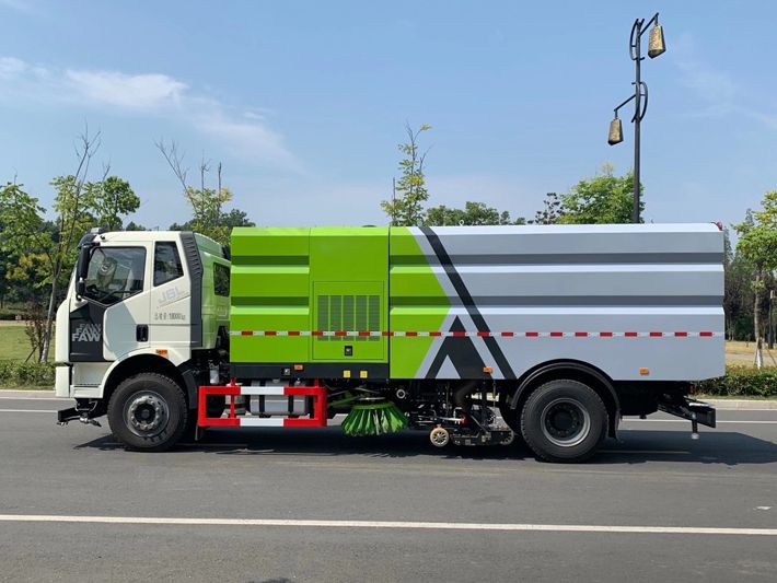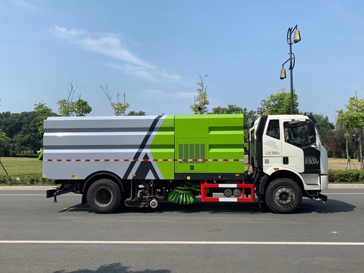帶2個中置掃盤;中置超寬吸嘴;雙層吸塵筒; 康明斯170馬力副發(fā)動機;臺灣液壓閥;大力馬達;德國高壓水泵 (前沖/側噴/中噴/后噴霧)/側沖洗水槍/垃圾箱自潔裝置); 萬向高壓路沿清洗;威龍低壓泵(前沖),氣動球閥控制; 4mm不銹鋼垃圾箱;不銹鋼水箱;德國控制器;尾部箭頭燈; 機油、垃圾箱、水箱均帶防溢或低位報警裝置;倒車及洗掃狀態(tài)室內(nèi)監(jiān)視器; 多種語音提示;倒車自動保護、防傾倒垃圾翻車保護、檢修安全保護; 20m高壓沖洗卷盤;刷臂轉動機構使用德國進口高新耐磨工程隔套,免打黃油; 冷彎無縫液壓油管;運動控制器一鍵電腦控制。洗掃寬度3.5m;吸入粒度p110mm。 湖北程力國六解放洗掃車多方位圖片: